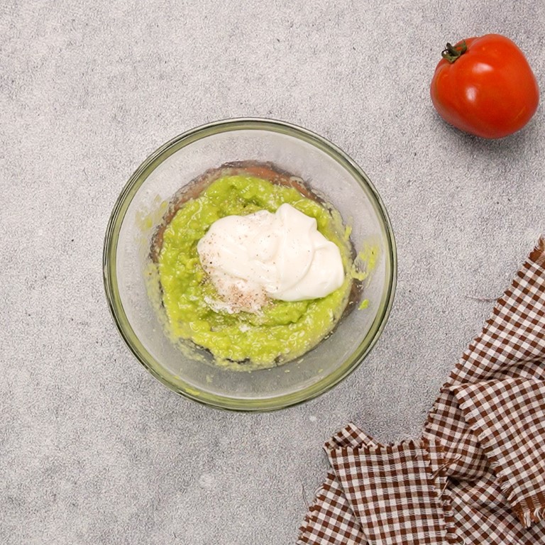 • Mash avocado in a mixing bowl. Add mayonnaise, salt, and pepper; mix well.