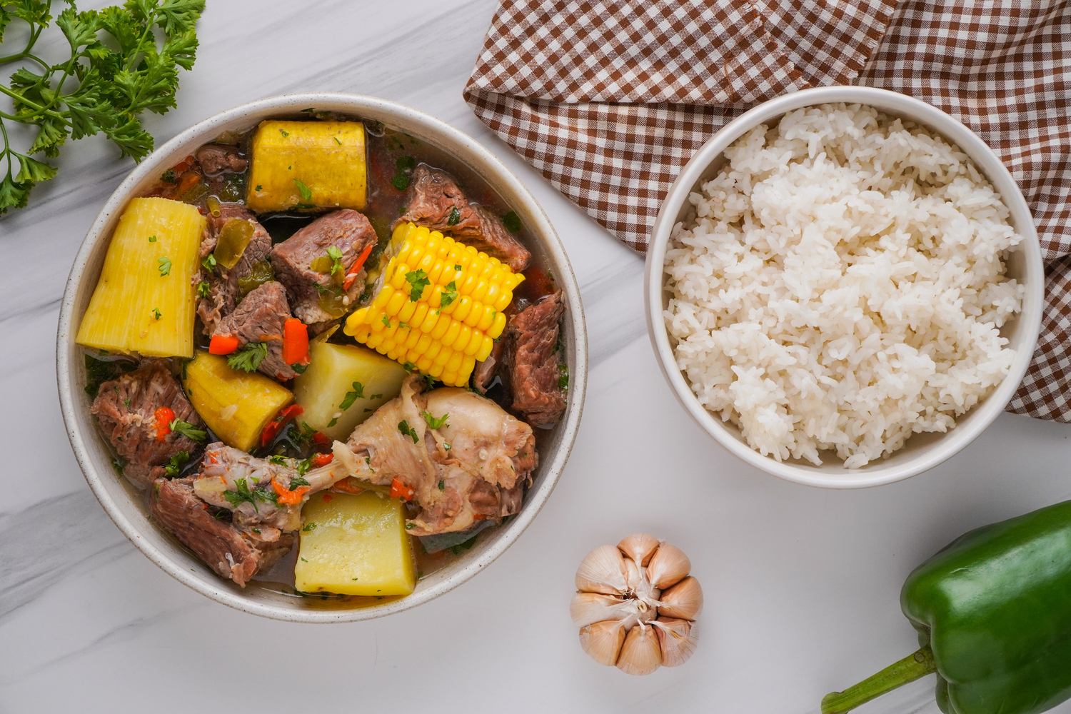 Ah, Sancocho! This hearty, one-pot wonder hails from Latin America and the Caribbean, where it has been delighting taste buds and warming souls for centuries. While there are several variations of this culinary masterpiece, the key is always layering flavors and textures, thanks to a blend of protein (beef and chicken, in our case) and starchy vegetables (corn, plantains, potatoes, and yuca).