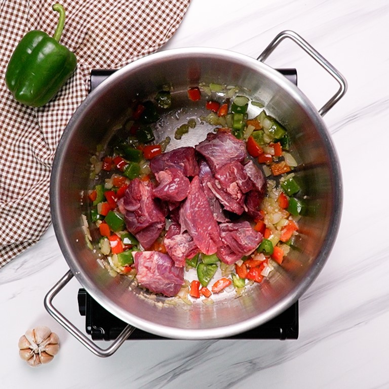 - Add the beef to the pot and cook for about 5 minutes, stirring occasionally, until the beef is browned on all sides.