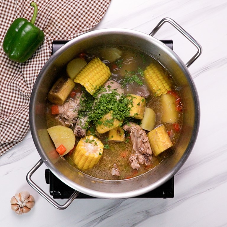 - Add the corn, green plantains, potatoes, and yuca to the pot. Stir well and let the mixture simmer for another 30 minutes, or until the vegetables are tender.