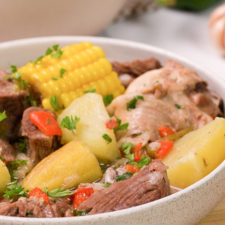 - Serve the sancocho hot, making sure to include a piece of beef, chicken, and each vegetable in every serving. Enjoy!