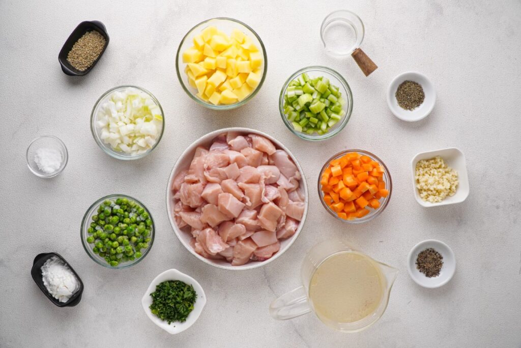 Prepare all ingredients by cutting the chicken into 1-inch pieces, dicing the potatoes, carrots, and celery, chopping the onion, and mincing the garlic.