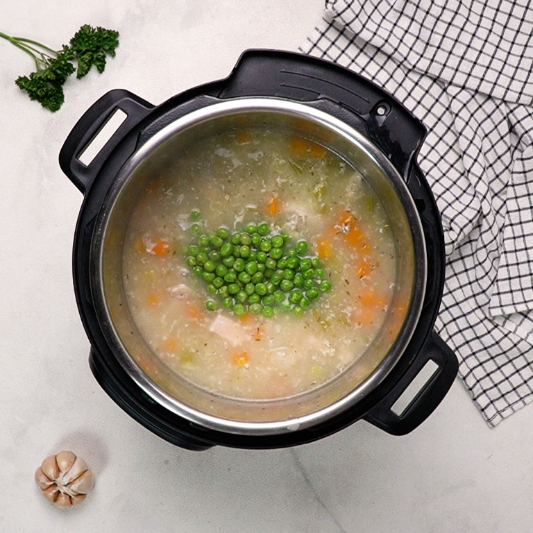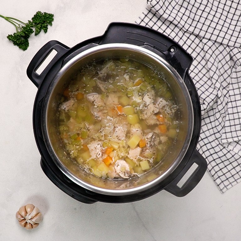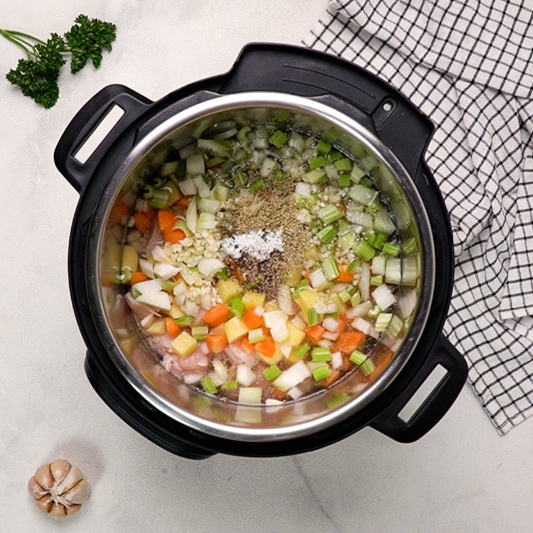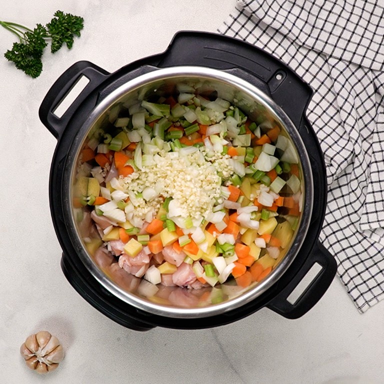 Place the chicken, potatoes, carrots, celery, onion, and garlic into the Instant Pot.
